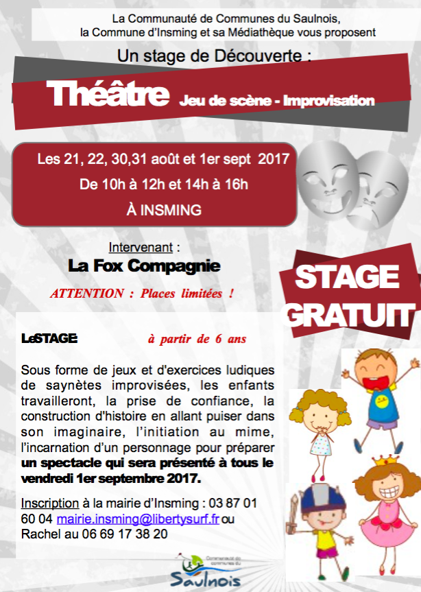 La Communauté de communes du Saulnois, la commune d'Insming et sa Médiathèque organisent les 21, 22, 30, 31 août et 1er septembre un stage de Théâtre (Jeu de scène et improvisation) animé par la Fox Compagnie.