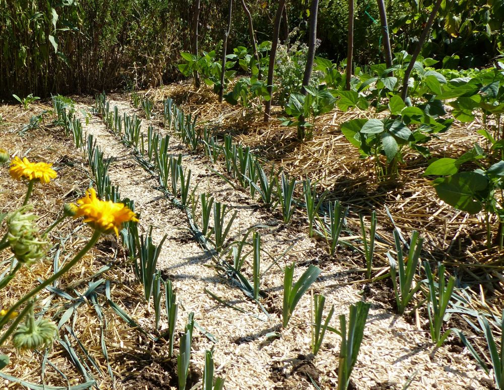 Avant le semis, j'ai fait une légère coupe du feuillage, ramené le paillage au pied des poireaux, et donné un léger coup de binette entre les rangs.