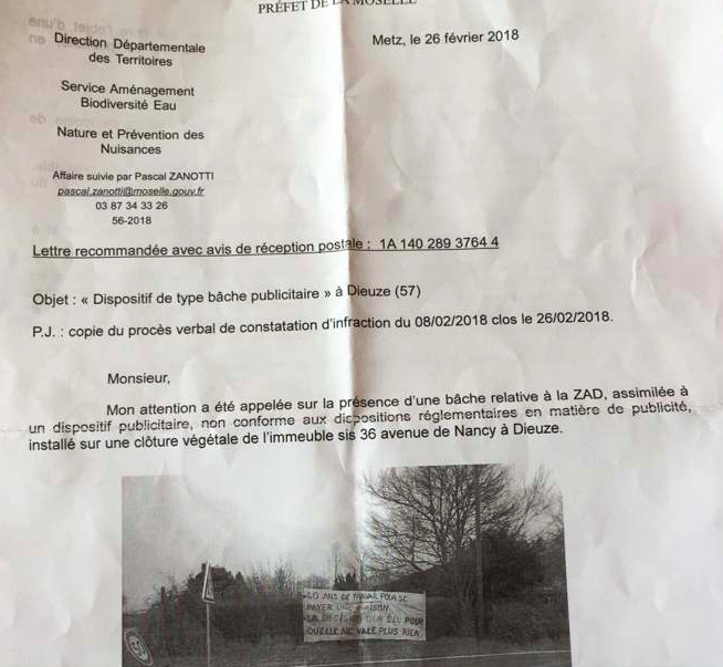 En effet le Préfet, par lettre recommandée, leur demande de retirer le panneau qu'ils avaient posé pour protester publiquement contre l'érection d'un mur de terre de 4m de haut au bout de leur jardin.