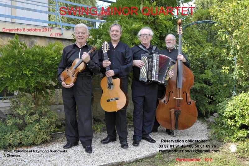 Marcel Lin au violon, Jean-Pierre Sauray à l'accordéon, James Szura à la guitare et Guy Schneider à la contrebasse dérouleront leur répertoire éclectique allant du Jazz manouche aux airs tziganes, des morceaux folkloriques arméniens en passant par quelques pièces plus classique (Bach, Brahms, Strauss) à Chenois le dimanche 8 octobre à 18h dans le cadre des concerts chez l'habitant organisés chaque année au domicile de Claudine Raymond Gierlowski.