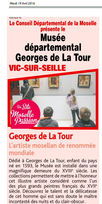 Ainsi, chaque jour on est heureux de voir dans la presse régionale un encart publicitaire pour le Château de Malbrouck, le Parc archéologique de Bliesbrück ou les jardins de Laquenexy. Aujourd'hui c'était au tour du musée Georges de La Tour d'avoir l'honneur des médias.